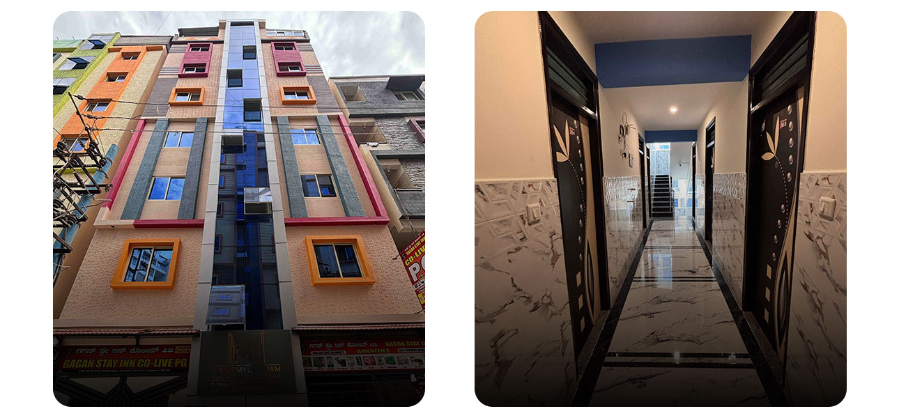 Construction of a G+6 building on a tight 1200 sq.ft footprint presented both engineering and execution challenges. Meticulous structural planning was required to support additional floor load while accommodating essential services like fire safety systems, service shafts, and dual stairwell access. Special attention was given to noise control, plumbing efficiency, and electrical zoning to ensure durability and tenant comfort. The interiors were designed to be minimal yet functional, prioritizing natural lighting, storage, and ease of maintenance. As one of the tallest PG buildings in the vicinity, Srivari Kuttera now stands as a modern, high-utility rental accommodation that meets the evolving needs of young professionals and students in the tech corridor.